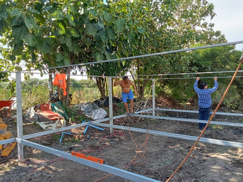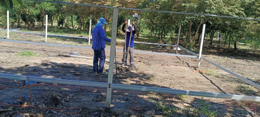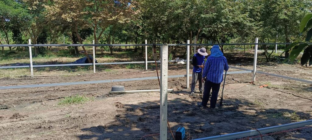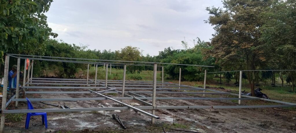ผู้จัดการโครงการฯ พี่ชาติ (สิทธิชาติ ตุ่มเจริญ) ก็ได้รายงานเข้ามาว่า ขณะนี้โรงเรือนเพาะแหนแดงผุพังไปมาก เสนอว่า…ควรเปลี่ยนเป็นโครงสร้างถาวรที่ทำด้วยเสาปูนและโครงเหล็กกัลวาไนซ์เพื่อจะทนทานใช้ได้นาน และที่สำคัญคือ ทีมงานเกษตรกรวันหยุดสามารถก่อสร้างเองได้ โดยไม่ต้องจ้างช่างภายนอกมารับเหมา ซึ่งปัจจุบันนั้นค่าจัดจ้างทำโรงเรือนแบบนี้ค่อนข้างราคาสูง เพราะหมวดค่าแรงจ้างช่างในบางคล้าเป็นแรงงานราคาสูง (ใช้ช่างคนไทย)